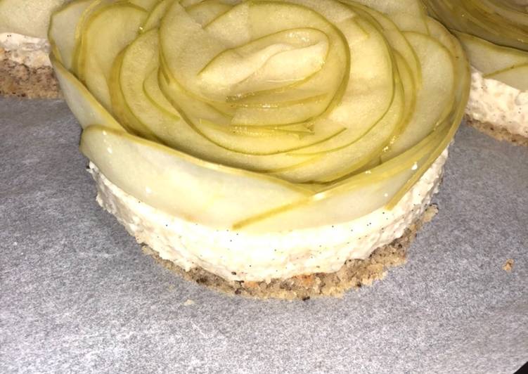 - Passer au dressage, emporte piecer des disque de biscuit joconde mettre un disque de riz au lait sorti 30 min avant la dégustation pour qu’il ne soit pas trop frais, puis mettre le disque de pomme au dessus et finissez par nappez les pommes avec le sirop restant.